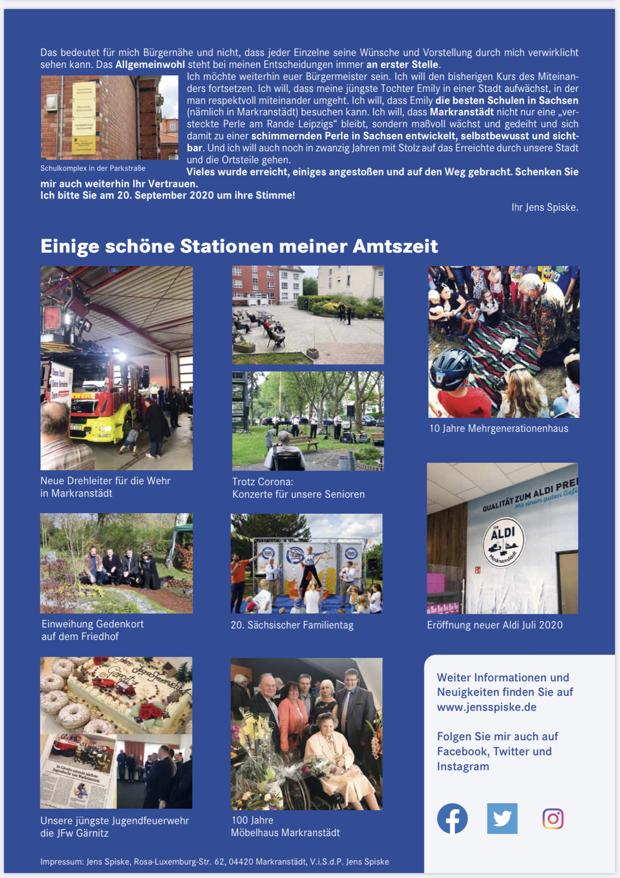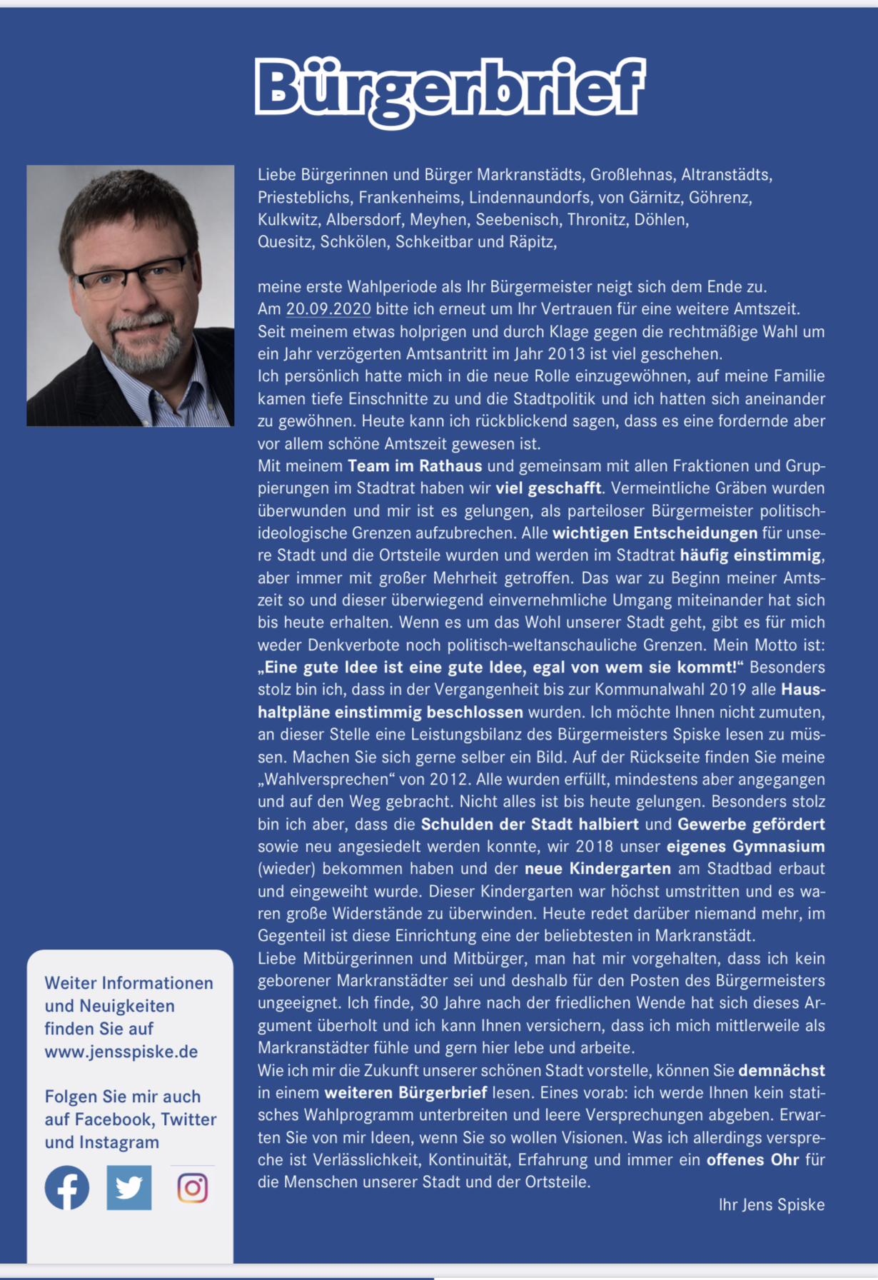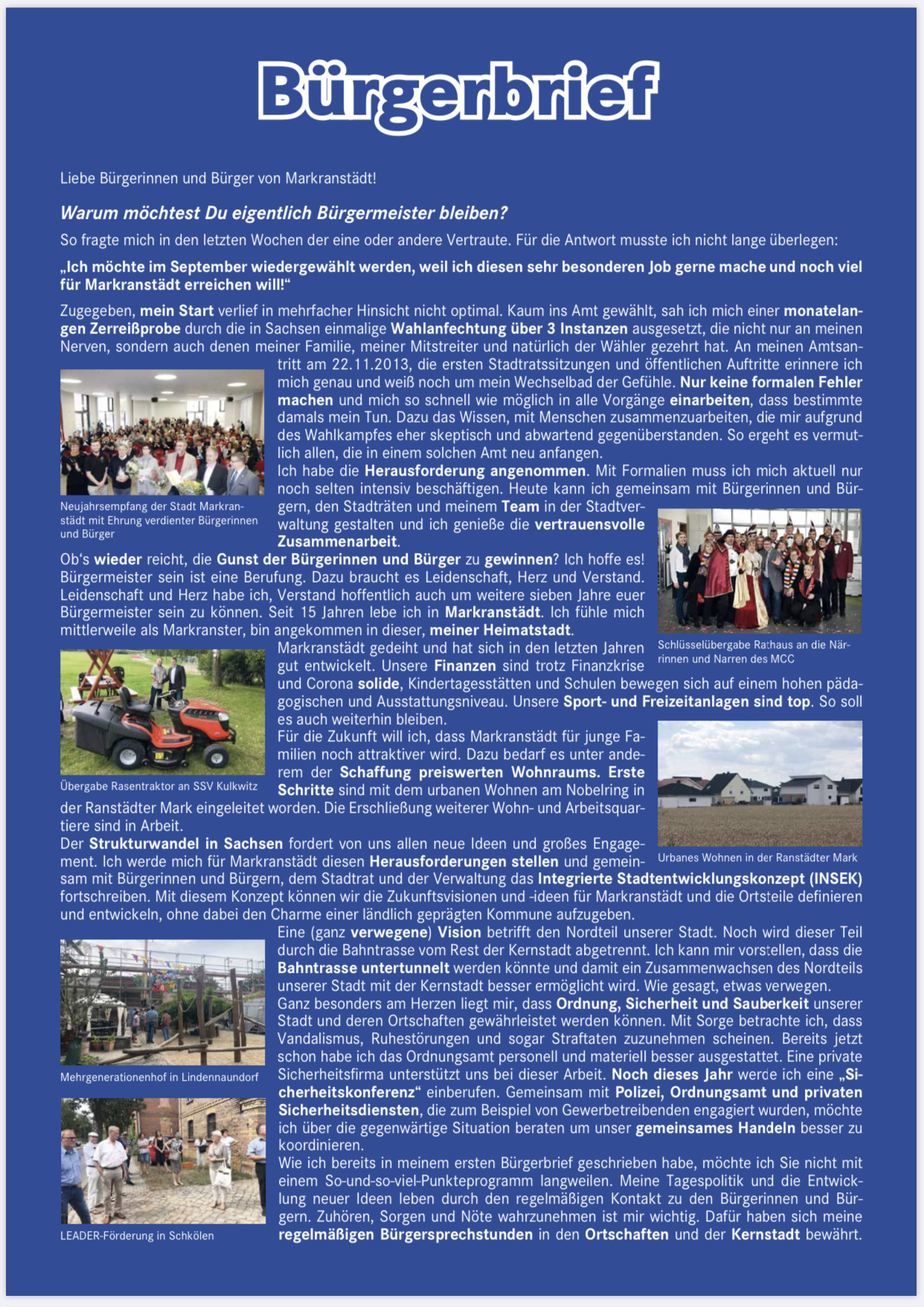Ich freue mich auf eine weitere Amtszeit um das Erreichte fortzusetzen und auszubauen. Mit Erfahrung, Ehrlichkeit und Sachkenntnis möchte ich weitere Jahre als politisch unabhängiger Bürgermeister für Markranstädt und seine Menschen arbeiten.